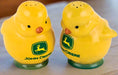 This adorable salt and pepper shaker set features two chicks each with the John Deere logo permanently fired to the stoneware. Under each chick is a rubber stopper for easy refilling. The set comes in a sturdy color gift box