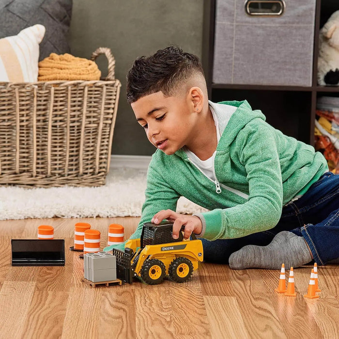 This skid steer play set features interchangeable pieces and plenty of construction cones for big jobs! Enjoy front loader and arm movement with a bucket and forks that are easily swapped. Plus, there are lights and sounds to make it that much closer to the real thing.