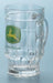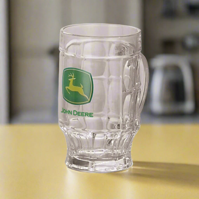 This sturdy glass mug features a prominent John Deere logo opposite the handle. A dimpled texture and tapered bottom decorate the sides and base of the glass.
