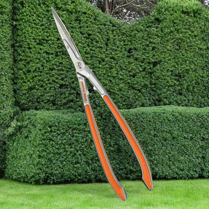 Designed for sculpting hedges, shrubs and decorative plants. Specially engineered with corrosion-resistant blades and measures 30” in length. Featuring strong, ergonomic handles with shock absorbers and high carbon steel blades, these hedge shears are specifically designed for trimming and sculpting.